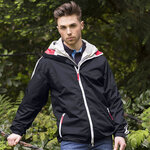 2000 Waterproof/2000 Breathable shell with fully taped seams. Contrast white stripe down sleeve with reflective tape. Contrast neck lining. Fold away hood. Unlined.Contrast 2-way front zip and pocket zips. Striped elastic shock cord through hood and hem. Plastic adjustable toggles at hood and hem. Internal storm flap on front with internal phone pocket.