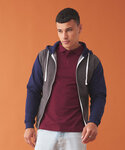 Full zip hoodie with metal zip. Slim fit. Contrast sleeves and hood. Twin needle stitching detailing. Double fabric hood. Contrast flat white drawcords. Kangaroo pouch pocket. Right hand side pocket has small hidden opening for earphone cord feed. Hidden ear phone loops. Ribbed cuff and hem. Worldwide Responsible Accredited Production (WRAP) certified production.