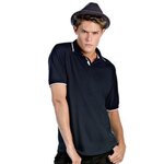 Short sleeved Pique polo shirt. Contrasted tipped cuffs and collar. Contrasted band on placket. Contrasted necktape. 1x1 rib knitted collar and cuffs. 3-button placket reinforced with fusible interlining. Side seams.