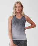 Fitted, high-stretch vest with round neckline and wide racer back. Self-fabric binding at neck and armholes. Blind stitch at hem. Seamless knit construction for comfort. Melange fabric with fade out/ombre colouring. Tombo tear-out label. WRAP certified. BSCI certified.